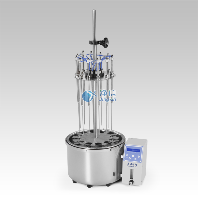 The SD-12 water bath nitrogen blowing instrument is a high-precision control instrument that combines microcomputer control technology and PID control. Its working principle is to blow nitrogen quickly, continuously and controllably to the surface of the heated sample, according to the concentration of the solvent. Evaporation speed and boiling point, set heating temperature, realize rapid oxygen-free concentration of a large number of samples. The water bath nitrogen blowing instrument includes a base and a support device, a sample holder and a gas distribution system. The test tube is fixed in position by a test tube clamp with a spring and a support plate. Each sample position has a digital number; the gas reaches the gas distribution system through the flow meter, and the flexible guide tube guides the gas into the valve and stainless steel needle at each position, blowing the gas to the sample surface, so that the solvent volatilizes quickly. According to the size of the test tube and the amount of solvent, each air duct can be independently raised and lowered to a suitable height.