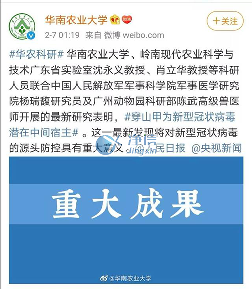 華南農(nóng)業(yè)大學的沈永義和肖立華對比了穿山甲和新型冠狀病毒感染者體內(nèi)的基因樣本,并結(jié)合其他研究結(jié)果,發(fā)現(xiàn)穿山甲可能是新型冠狀病毒的潛在來源。兩位研究人員在2月7日舉行的新聞發(fā)布會上表示,二者序列之間的相似度高達99%。